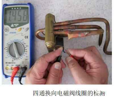 如上图所示,将数字型万用表置于“2k”挡,测四通换向电磁阀线圈的阻值为 1.458kΩ左右,说明线圈正常;若阻值过大,说明线圈开路;若阻值过小,说明线圈短路。还可以采用交流电压挡测量线圈两端电压的方法进行判断,线圈两端有无220V 电压时,四通换向电磁阀内部应该换向,否则说明四通换向电磁阀已损坏。另外,通电后若线圈过热,说明线圈有匝间短路的现象。
