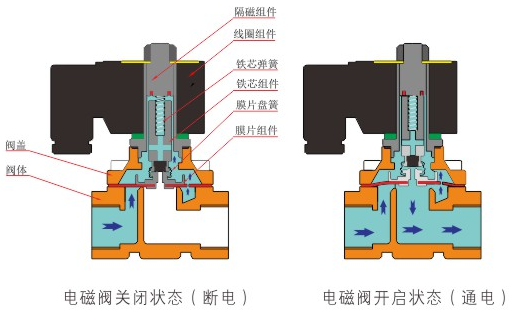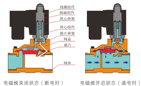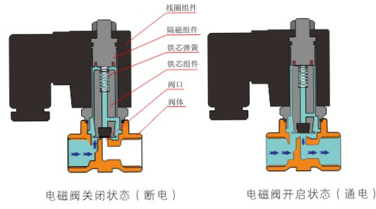 原理:星空官方站网站-星空(中国)直动式电磁阀分常闭型和常开型两种。常闭型电磁阀断电时为关闭状态,线圈通电时产生电磁力,动铁芯跟静铁芯吸合,电磁阀阀口打开,介质(流体)通过;当电磁阀线圈断电时电磁阀消失,在弹簧的作用力下,电磁阀动铁芯复位,阀口关闭,介质(流体)不同,电磁阀呈关闭状态。常开型与之相反。